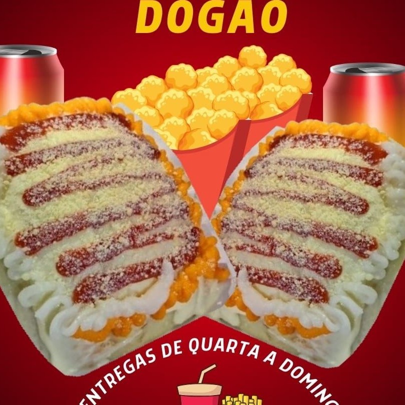 1 Dogão =1 Pão de banha, 1 Salsichas, Vinagrete, Repolho, Batata palha, Purê, Maionese, Ketchup, Mostarda, Cheddar, Catupiry e Queijo ralado + 1 Refrigerante 350ml