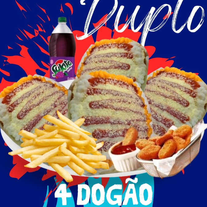 4 Dogão Duplo = 1 Pão de banha, 2 Salsichas, Vinagrete, Repolho, Batata palha, Purê, Maionese, Ketchup, Mostarda, Cheddar, Catupiry e Queijo ralado + Batata Frita M , 1 Porçaão Nuggts M + 1 Refri 2 Litros