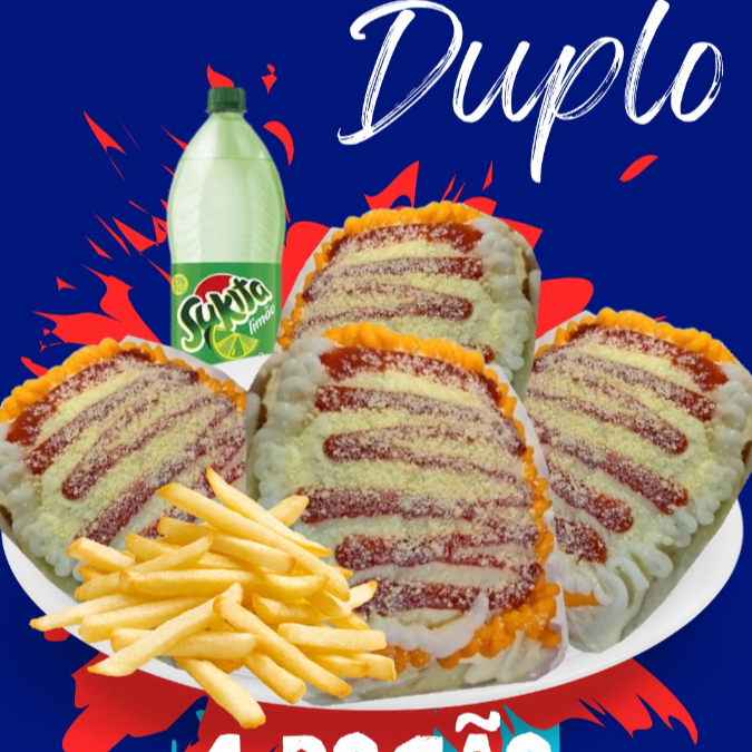 4 Duplo = 1 Pão de banha, 2 Salsichas, Vinagrete, Repolho, Batata palha, Purê, Maionese, Ketchup, Mostarda, Cheddar, Catupiry e Queijo ralado + 1 Batata Frita Media