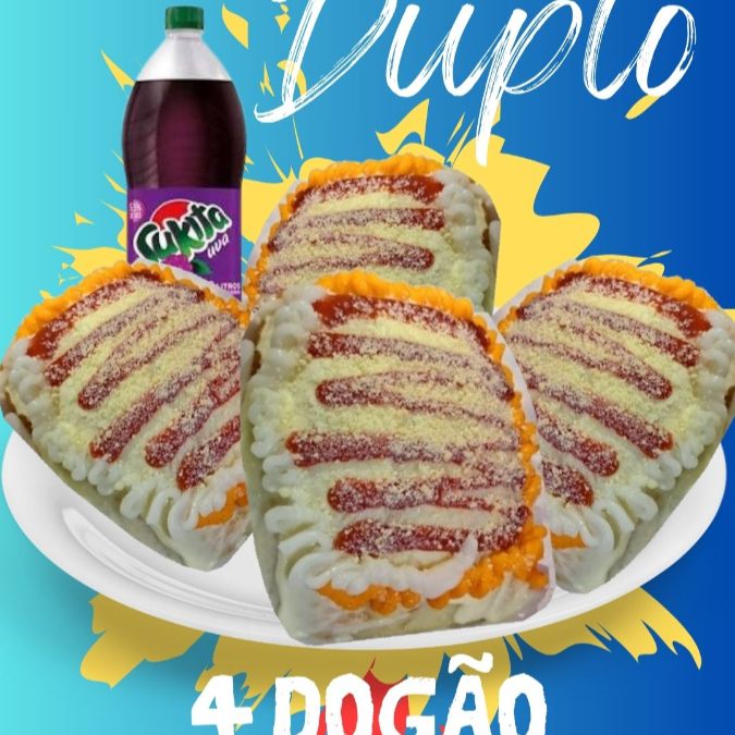4 Dogão Duplo = 1 Pão de banha, 2 Salsichas, Vinagrete, Repolho, Batata palha, Purê, Maionese, Ketchup, Mostarda, Cheddar, Catupiry e Queijo ralado + Porção Batata Frita Media + 1 Refri 2 Litros