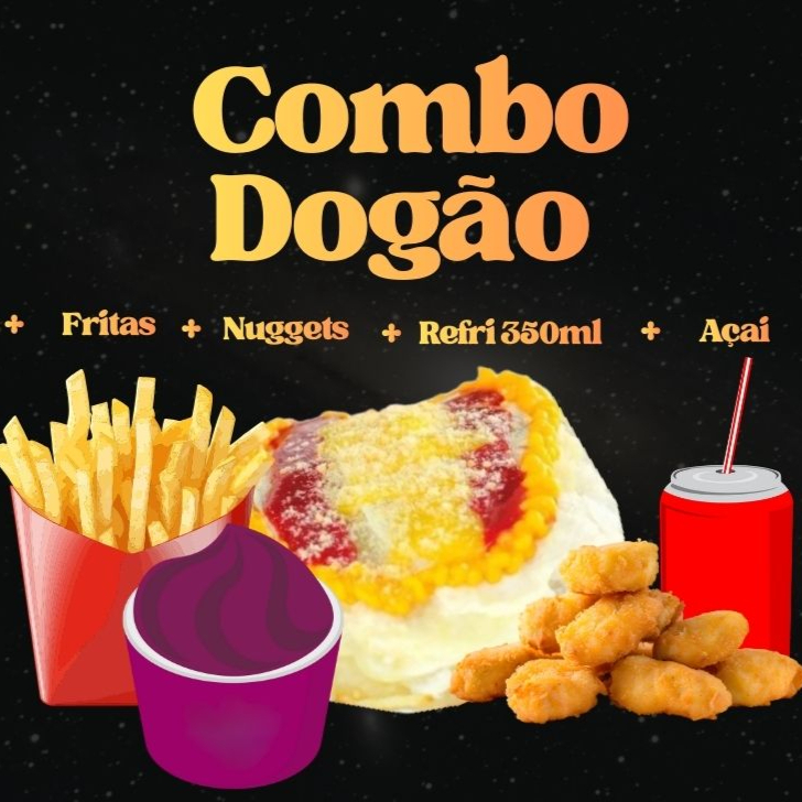 1 Dogão =1 Pão de banha, 1 Salsichas, Vinagrete, Repolho, Batata palha, Purê, Maionese, Ketchup, Mostarda, Cheddar, Catupiry e Queijo ralado + Batat Frita P + Porçaão Nuggts P + 1 Refrigerante 350ml + Açái 250ml