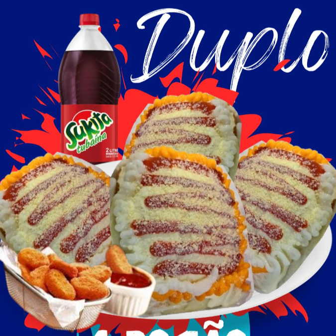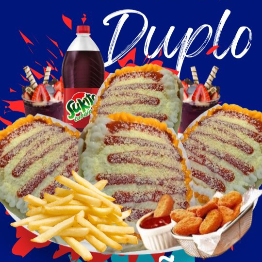 2 Duplo = 1 Pão de banha, 2 Salsichas, Vinagrete, Repolho, Batata palha, Purê, Maionese, Ketchup, Mostarda, Cheddar, Catupiry e Queijo ralado + 2 Batata Fritas P + 2 Porçaão Nuggts P + 2 Refrigerante 350ml + 2 Açái 250ml