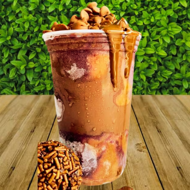 Milkshake feito com sorvete de creme, batido com paçoca e leite em pó