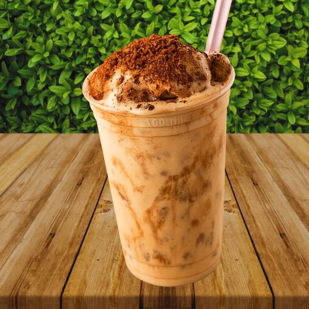 Milkshake feito com sorvete de creme, batido com Ovomaltine e Ovomaltine no topo.