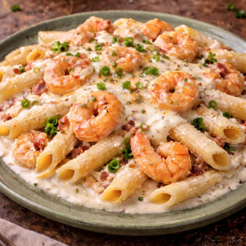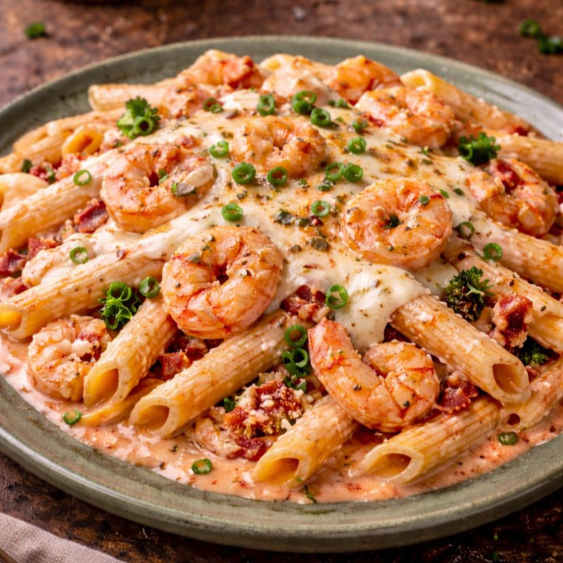 Uma deliciosa Macarrão envolto em um cremoso e suave molho rosé, acompanhado de camarões suculentos e finalizado com queijo derretido e um toque de cebolinha fresca, criando uma experiência gastronômica rica e irresistível.