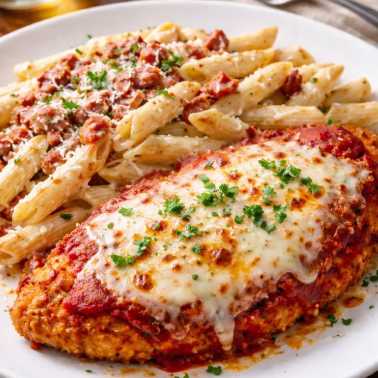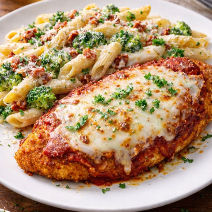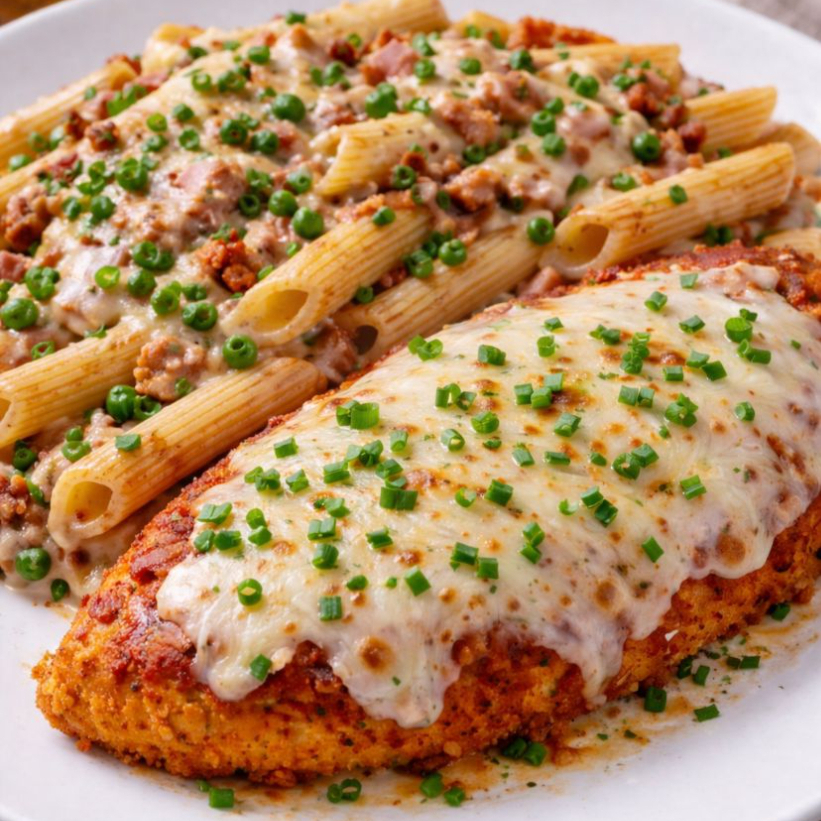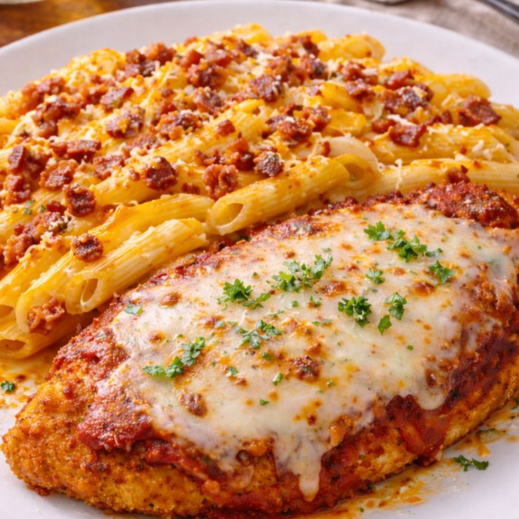 Uma suculenta parmegiana de frango, empanada e dourada na medida certa, servida ao lado de um macarrão penne envolvido em um cremoso molho quatro queijos com bacon crocante. Finalizado com uma generosa camada de queijo derretido e um toque fresco de cebolinha, esse prato combina sabor, cremosidade e conforto em cada garfada.
