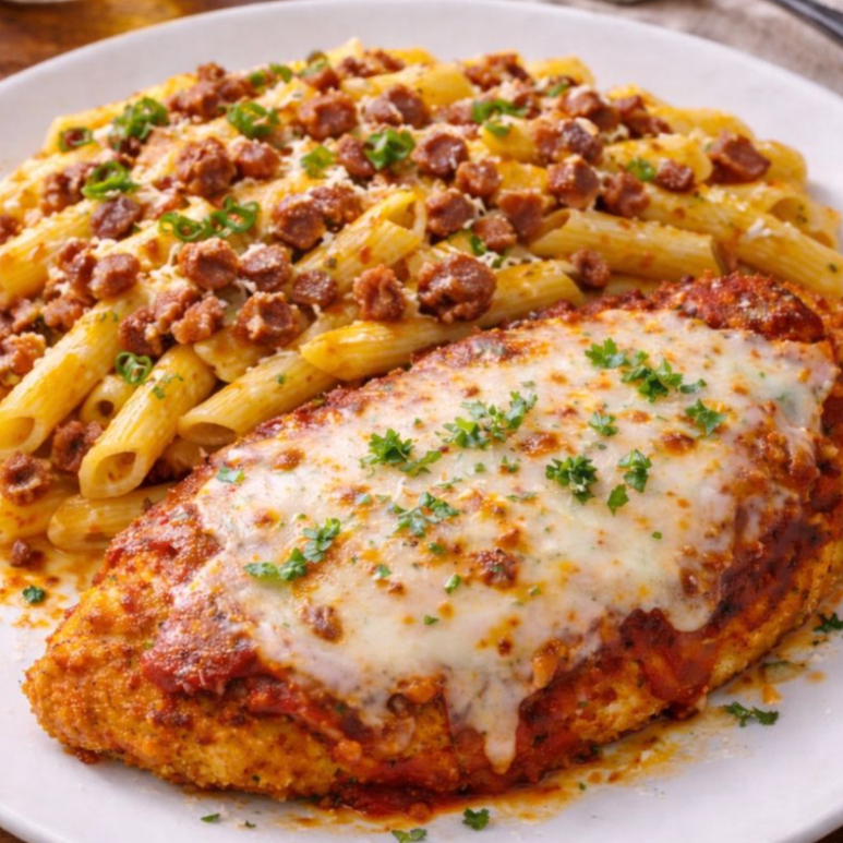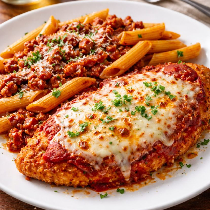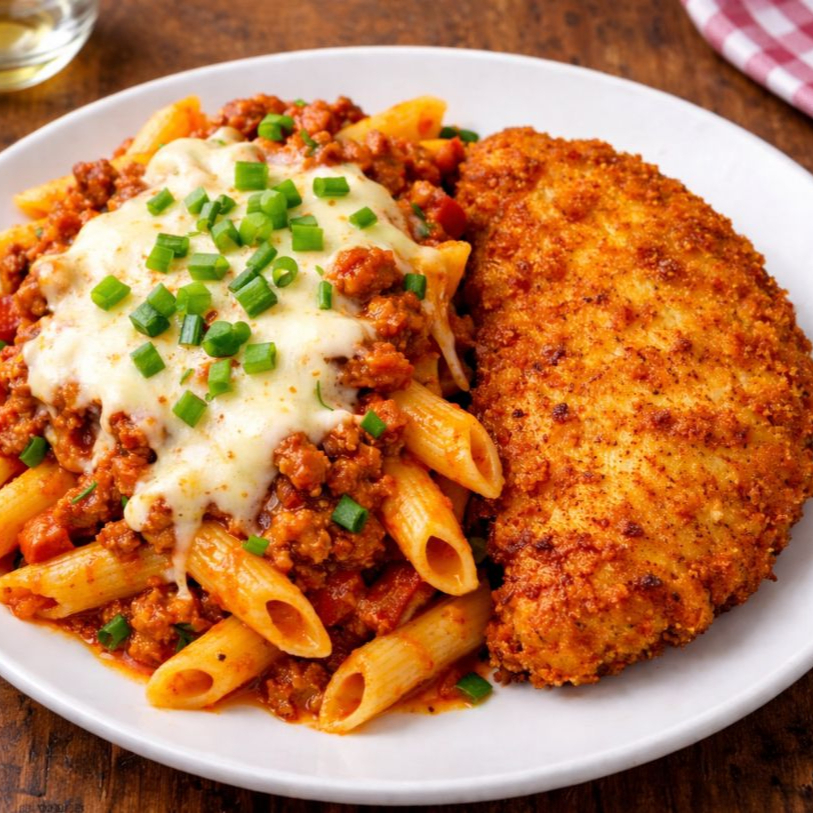 Uma irresistível Parmegiana de Frango servida com macarrão à bolonhesa com bacon crocante, criando a combinação perfeita entre suculência e sabor caseiro. Finalizado com queijo derretido e um toque de cebolinha fresca, esse prato entrega aroma, cremosidade e aquele gosto de comida feita com carinho. Ideal para quem ama uma refeição completa e marcante!