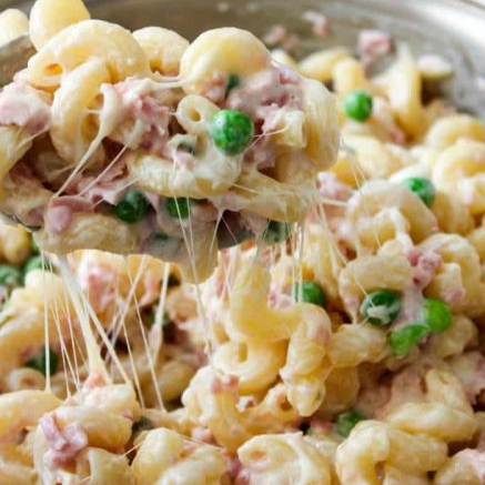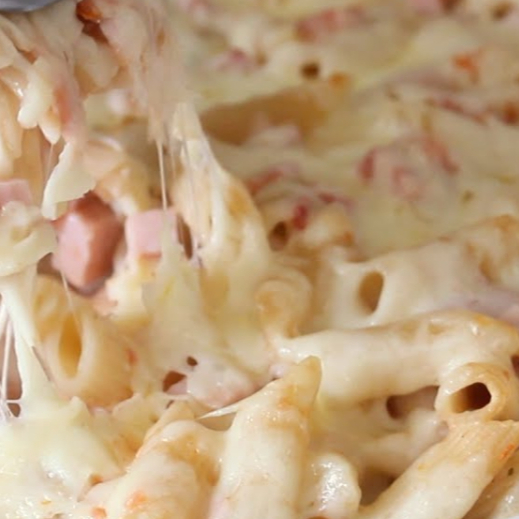 Macarrão a paulistano, preparado com um delicioso molho branco, presunto, muito queijo, finalizado com mais queijo e cebolinha.