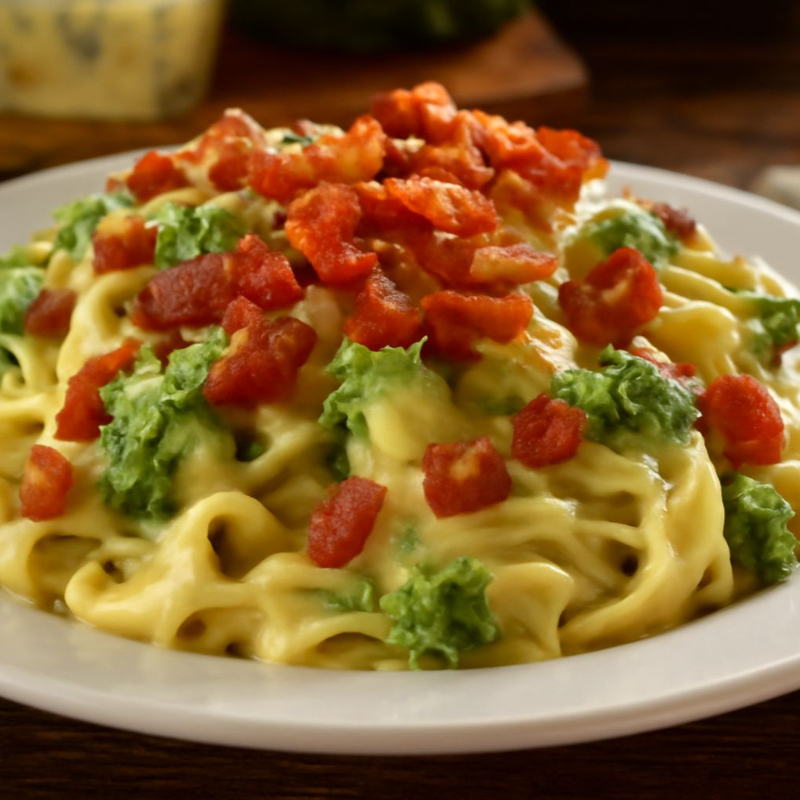 Uma deliciosa Parmegiana de Frango acompanhada de um macarrão de brócolis ao molho branco cremoso, enriquecido com bacon crocante que dá aquele toque especial de sabor. Finalizado com queijo derretido e cebolinha fresca, esse prato entrega suculência, textura e uma explosão de aroma que conquista no primeiro garfo. Uma combinação farta, deliciosa e irresistível!