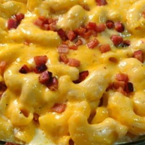 Um Clássico da culinária dos Eua, Mc'n Cheese, preparado com Creme de cheddar, bacon, muito queijo e cebolinha para finalizar.
