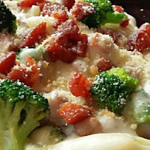 Brócolis fresco preparado com especiarias, um delicioso molho branco, bacon, queijo, finalizado com mais bacon, queijo e cebolinha. Uma delicia!