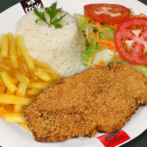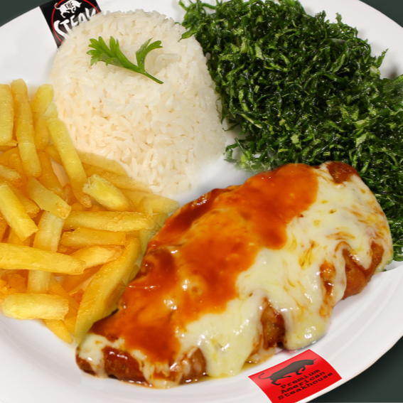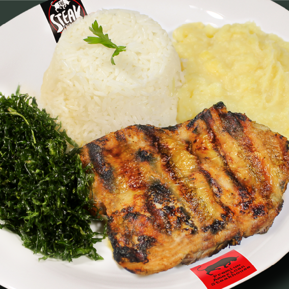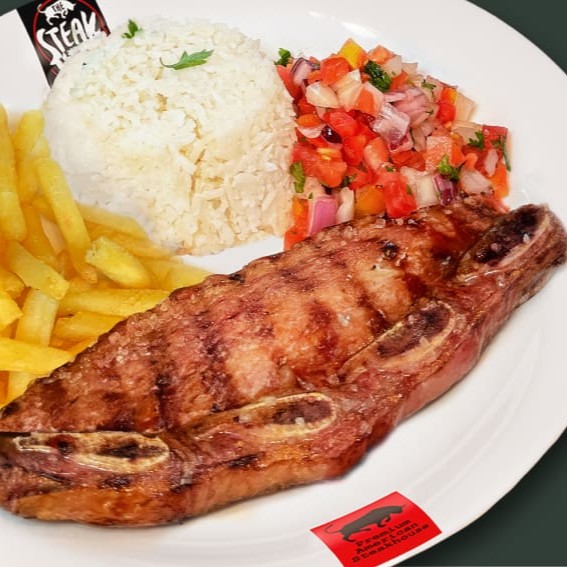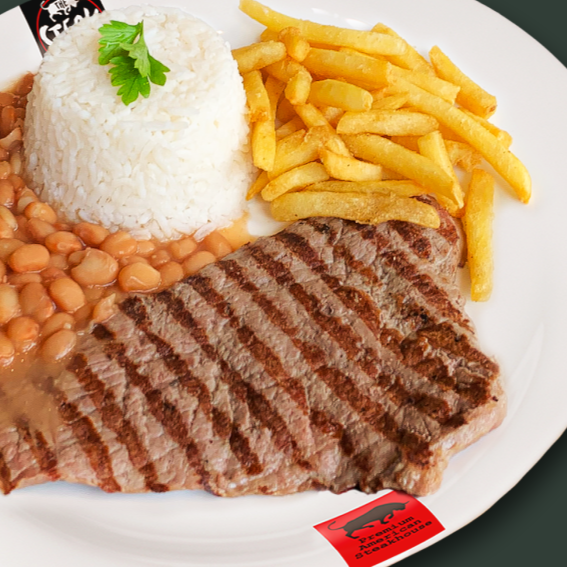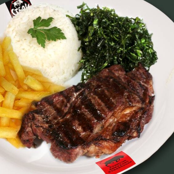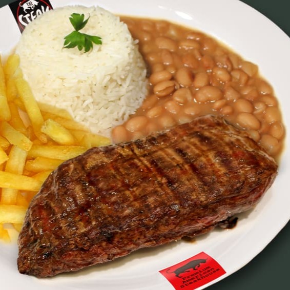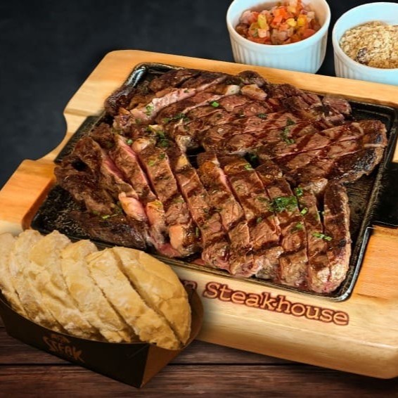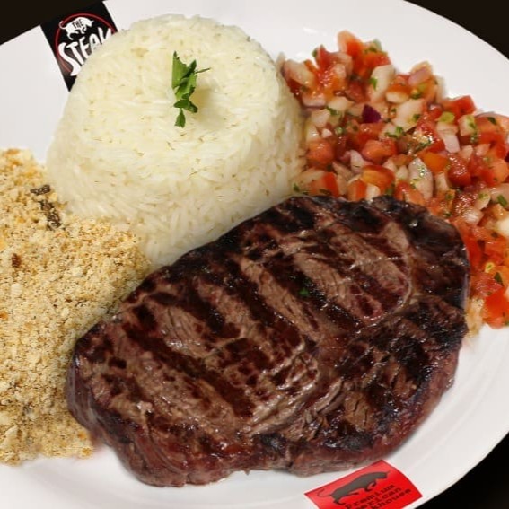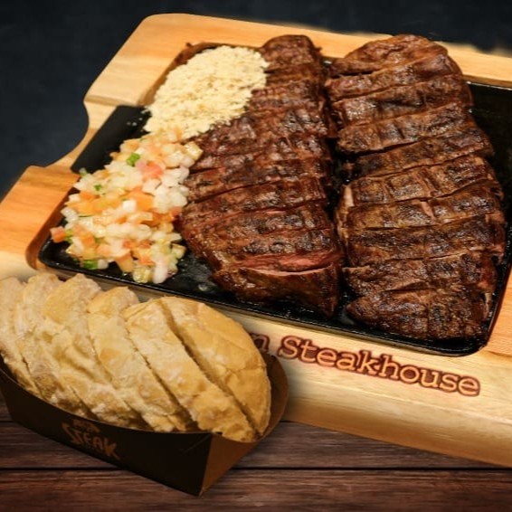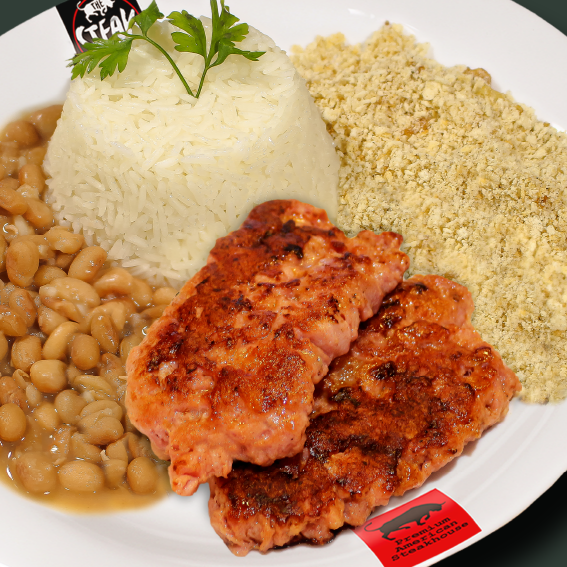 2 unidades de aproximadamente 260 gramas cada de American Steak fatiado + Farofa + Vinagrete – Acompanha 1 Pão Rústico em Fatias (os pesos informados dos cortes são in natura)