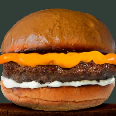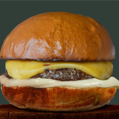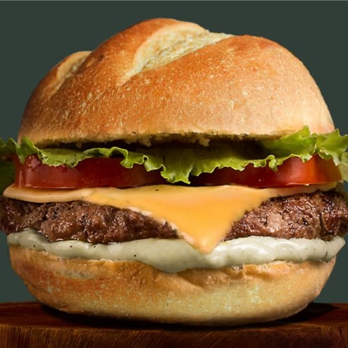 Pão, Queijo Cheddar Cremoso, Maionese Artesanal, Hambúrguer de Ervilha grelhado.