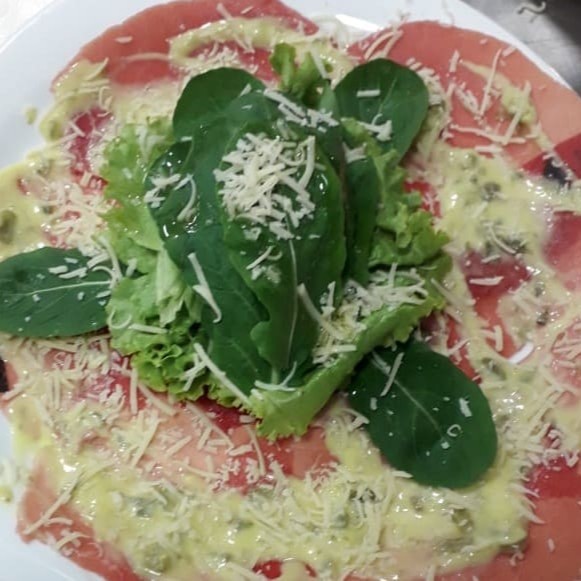 Delicioso Carpaccio com molho de mel, mostarda e alcaparras.