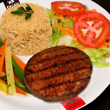 Delicioso Hambúrguer de fraldinha grelhado e servido no prato com 3 acompanhamentos de sua preferência.