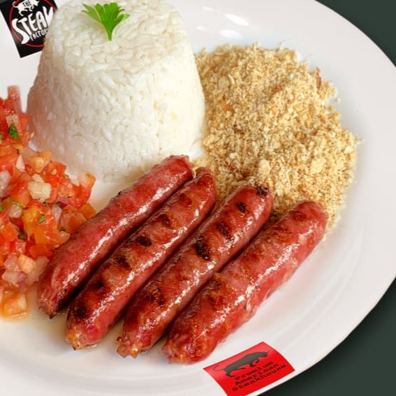 8 unidades de Linguiça de Costela Bovina Grelhada Acebolada + Farofa + Vinagrete – Acompanha 1 Pão Rústico em Fatias. “Linguiça de Costela levemente apimentada”