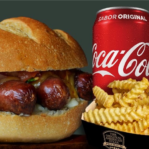 Pão, Queijo American Cheese, Maionese Artesanal, Vinagrete, Linguiça de Costela Bovina Angus. O Combo acompanha 01 Sandwich + 01 Bebida + 01 Batata Frita. “Linguiça de Costela levemente apimentada”