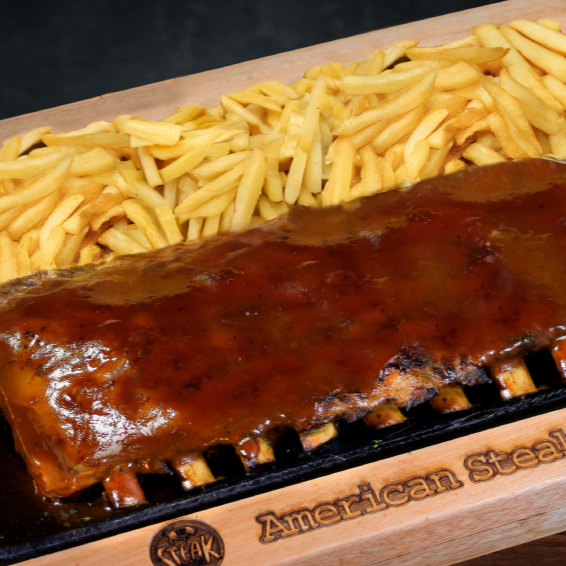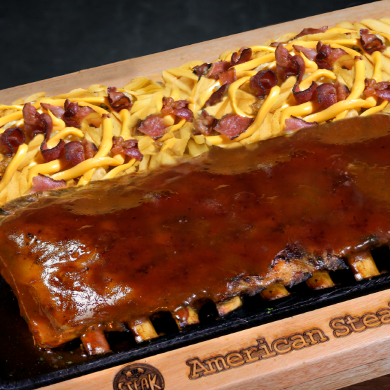 Experimente nossa deliciosa Costelinha Suína servida com o nosso famoso molho barbecue da casa e acompanhada de Batatas Fritas com Cheddar Cremoso e pedaços de Bacon.