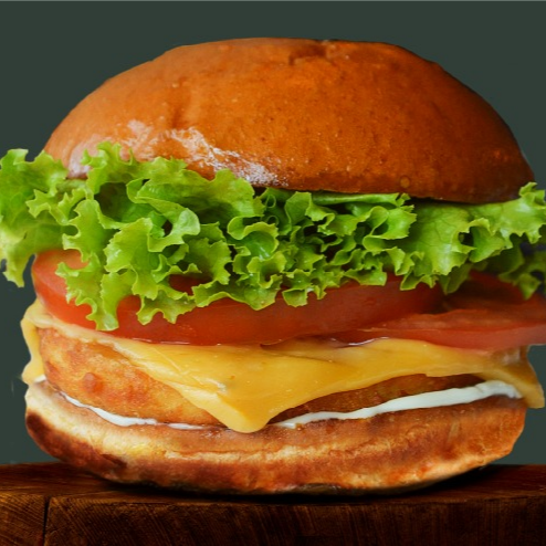 Pão, Alface, Tomate, Queijo American Cheese, Maionese Artesanal, Hambúrguer de Peito de Frango Empanado.