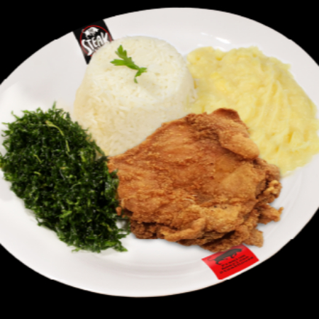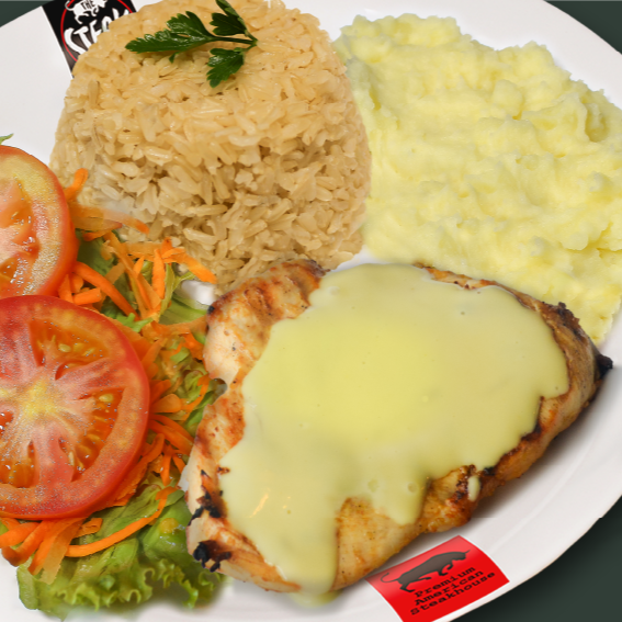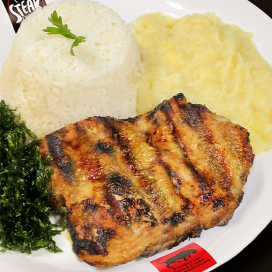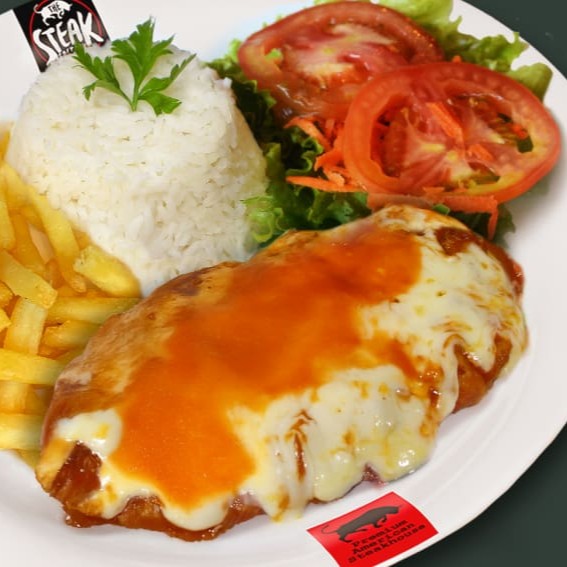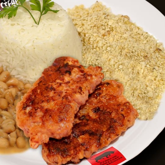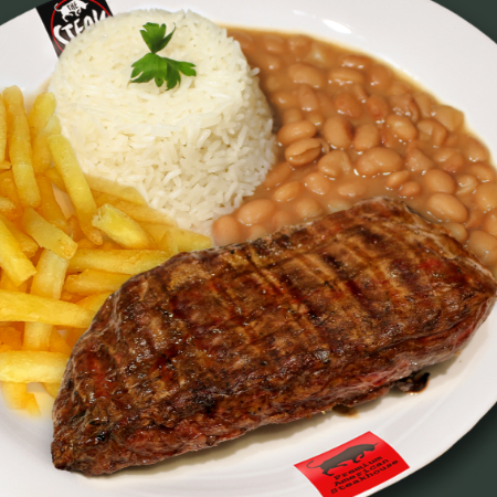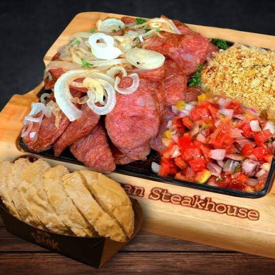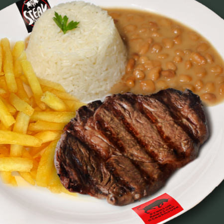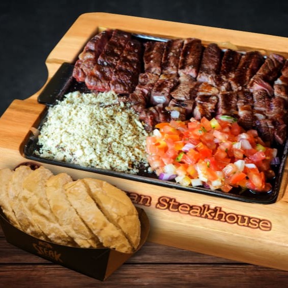2 unidades de aproximadamente 260 gramas cada de American Steak fatiado + Farofa + Vinagrete – Acompanha 1 Pão Rústico em Fatias (os pesos informados dos cortes são in natura)