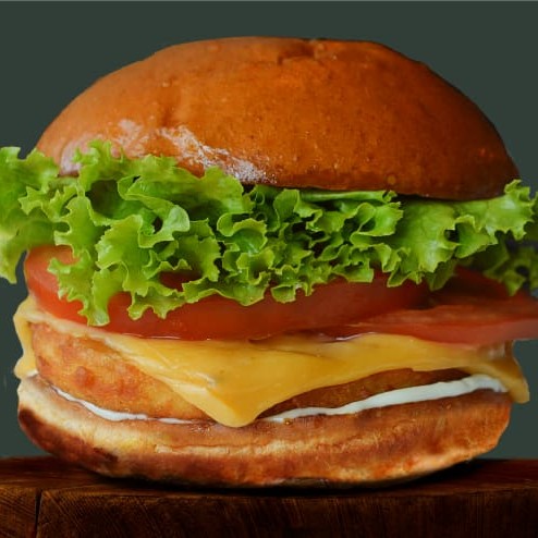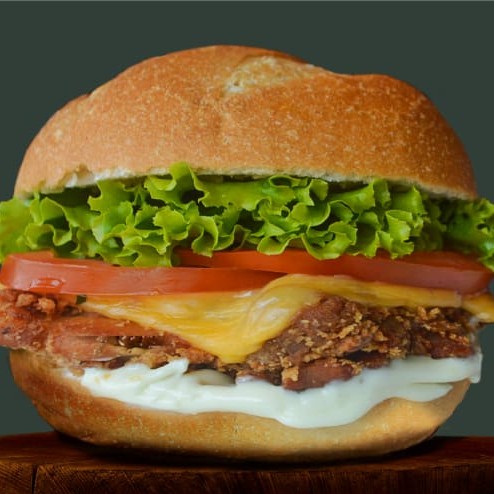 Pão, Alface, Tomate, Queijo American Cheese, Maionese Artesanal, Hambúrguer de Peito de Frango Empanado.