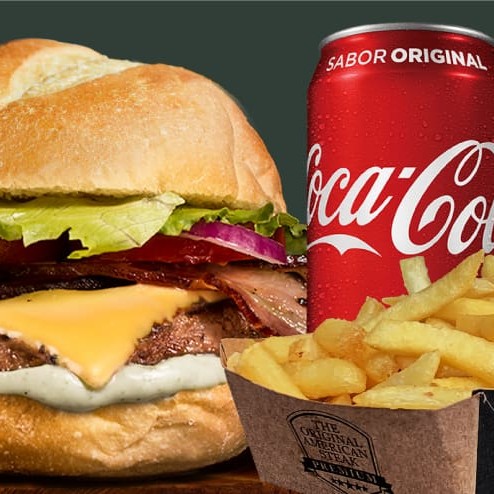 O gigante de sabores! Pão, Hambúrguer de Fraldinha 150g, Alface, Tomate, Uma fatia de Queijo American Cheese, Maionese Artesanal, Cebola Roxa e o suculento Bacon Grelhado. O combo acompanha 01 burger + 01 bebida + 01 fritas.