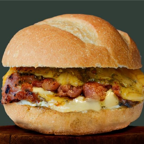 Pão, Uma fatia de Queijo American Cheese, Maionese Artesanal, Hambúrguer de Fraldinha 150g.