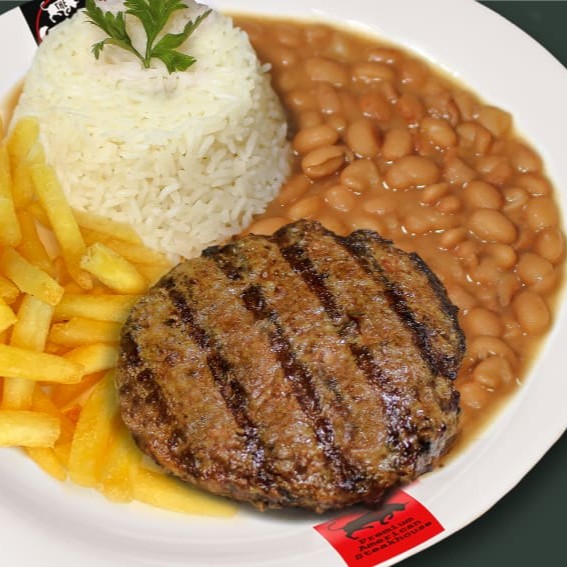 Delicioso Hambúrguer de fraldinha grelhado e servido no prato com 3 acompanhamentos de sua preferência.