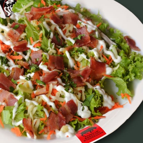 Pedaços de Bacon, Alface, Cenoura Ralada, Mussarela e Molho Ranch.