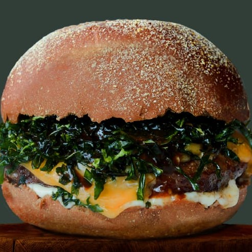 Pão, Queijo American Cheese, Maionese Artesanal, Couve Crispy, Molho Barbecue, Hambúrguer de Fraldinha 150g.