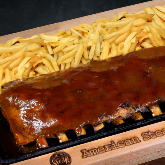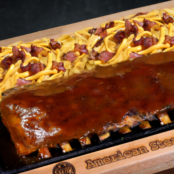 Experimente nossa deliciosa Costelinha Suína servida com o nosso famoso molho barbecue da casa e acompanhada de Batatas Fritas com Cheddar Cremoso e pedaços de Bacon.