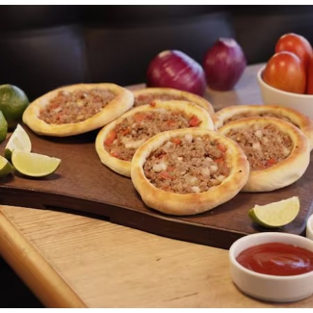 Deliciosa esfiha de carne da categoria 'Esfihas Abertas - Salgadas'. Esta tentadora iguaria é cuidadosamente preparada com carne moída, rigorosamente selecionada, e combinada com suculentos tomates e cebola finamente picada. Cada detalhe é pensado para realçar o sabor, incluindo nosso tempero especial, que confere um toque único e inesquecível a cada mordida.