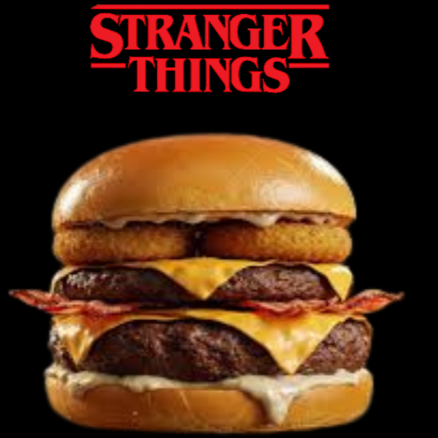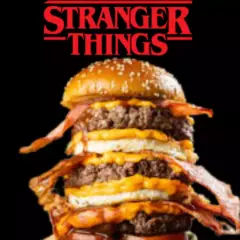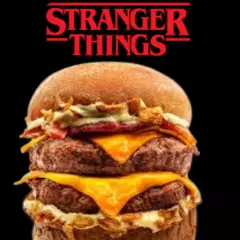 Diretamente do Mundo Invertido para o seu prato! Dois hambúrgueres artesanais vegetarianos à base de soja (plant based) queijo especial derretendo em camadas, cebola caramelizada, bacon vegano crocante . Tudo finalizado com nossa Strangernese, a maionese misteriosamente deliciosa que vai te deixar de cabeça (e apetite) virada!