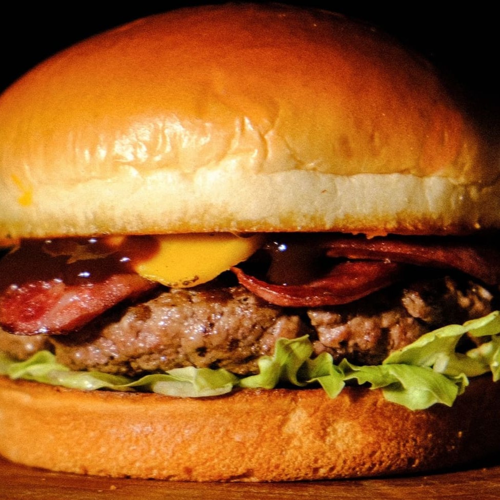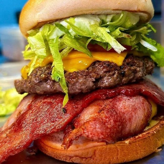 🍔 Pão de brioche premium 🥩 Dois hamburgues de 150g cada 🥬 Alface americano 🍅 Finas fatias de tomate 🧀 Queijo fatiado cheddar 🥓 Bacon fatiado 🧄 Molho de alho (Molho da casa)