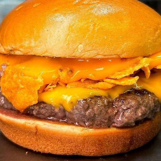 🍔 Pão de brioche premium 🥓 Bacon em cubinhos 🥩 150 gramas de carnes nobres 🧀 Queijo fateado cheddar 🧡 Creme cheddar com Doritos 🧅 Cebola crua temperada (Combina, vai pela tia)