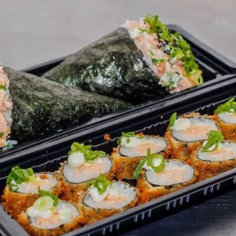2 baterá de salmão grelhado 8 uramaki de salmão grelhado 1 temaki de salmão grelhado 120g