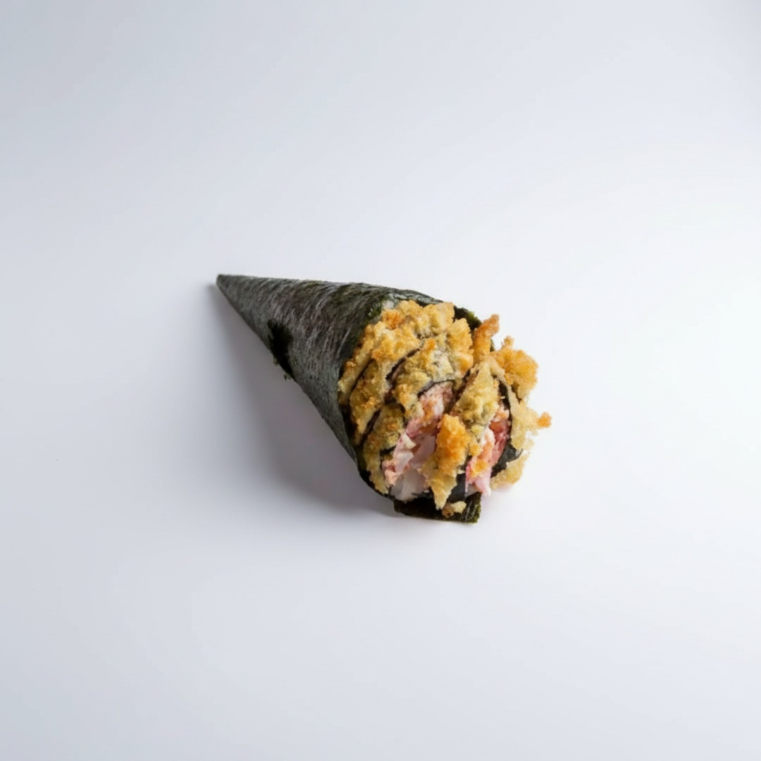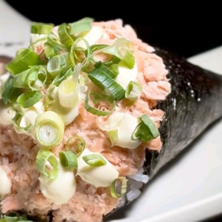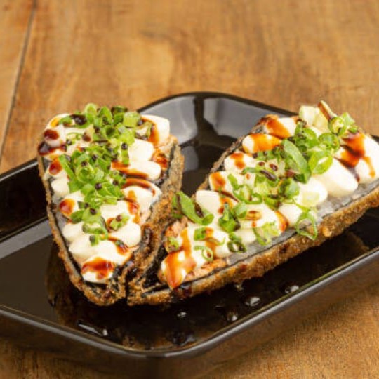 Temaki de salmao grelhado e empanado Cortado no meio com creme cheese e cebolinha
