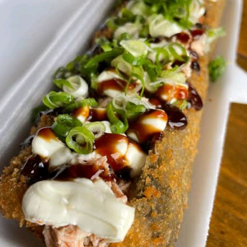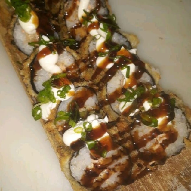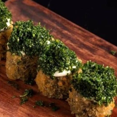 Emrrolado empanado cortado em 8 uni com creme cheese e cebolinha em cima