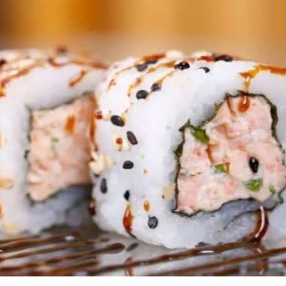 Enrrolado de arroz por fora com salmao grelhado com creme cheese e cebolinha por dentro