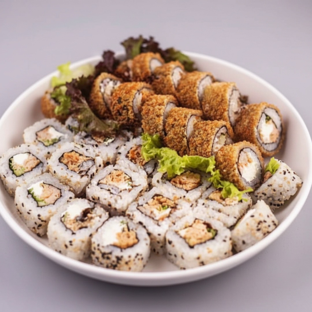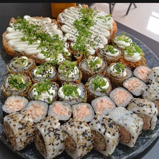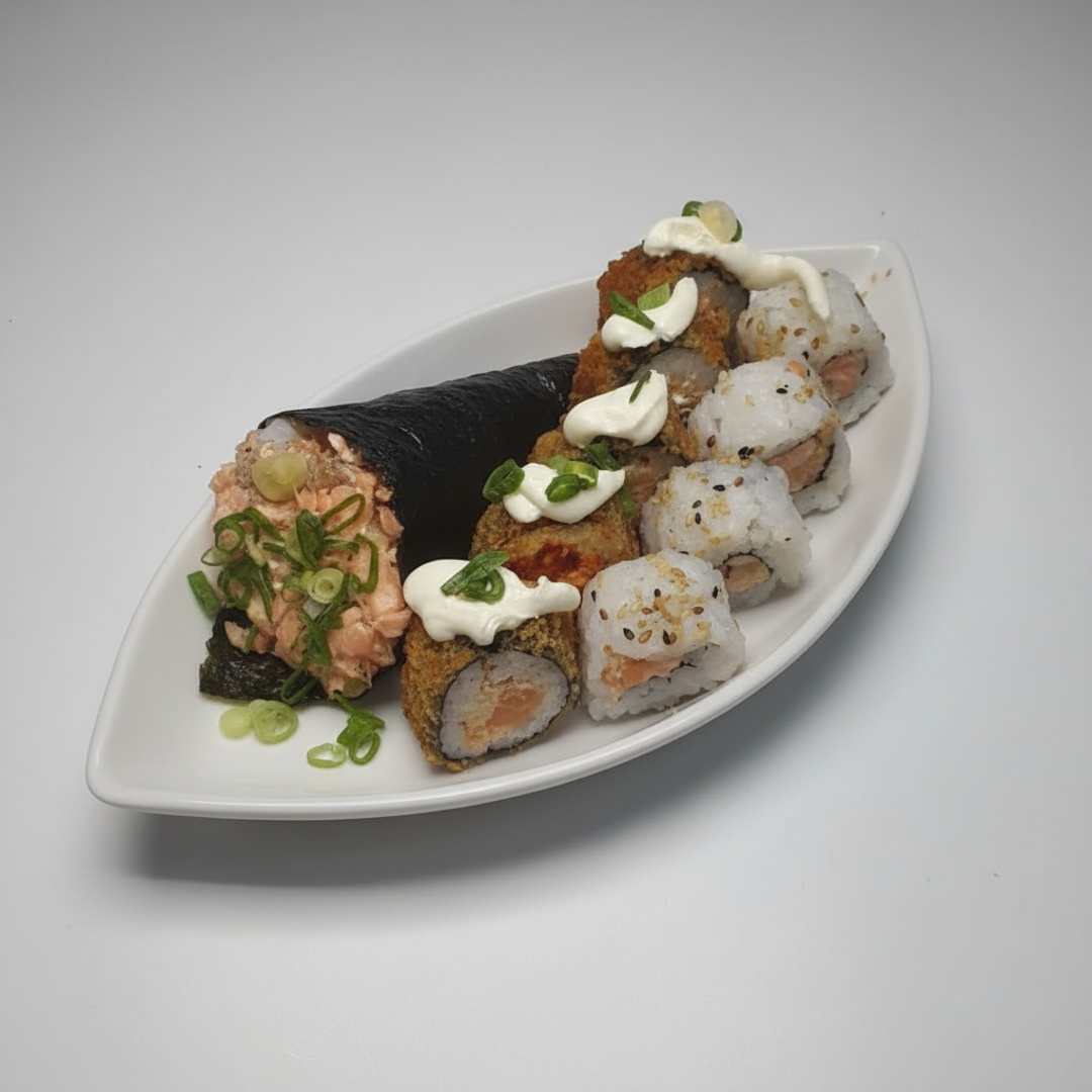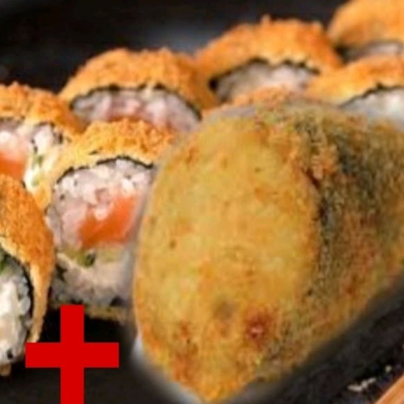 10 htholls + 1 temaki de salmão grelhado e empanado cortado no meio com creme cheese e cebolinha