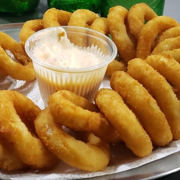 Porção de anéis de cebola, triturados, empanados e frito (25un)