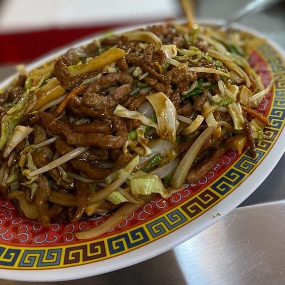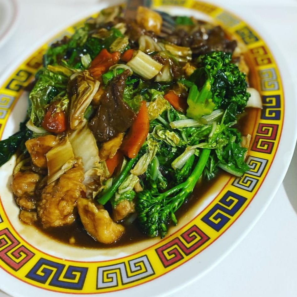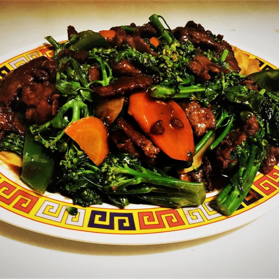 Carne vermelha cartada em fatias finas maias. Brócolis, pimentão, cenoura e bambu ao dente. Um prato perfeito para comer com o arroz chopsuey da casa.