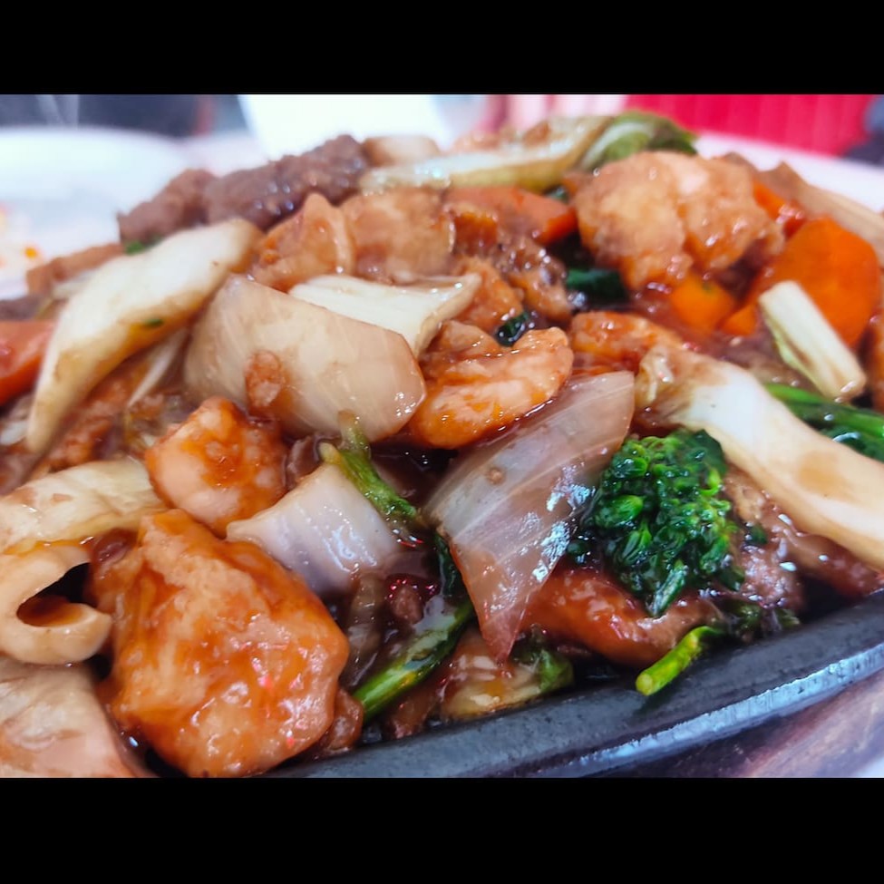 Mistura de carne, frango, camarão, lula e legumes na chapa.
