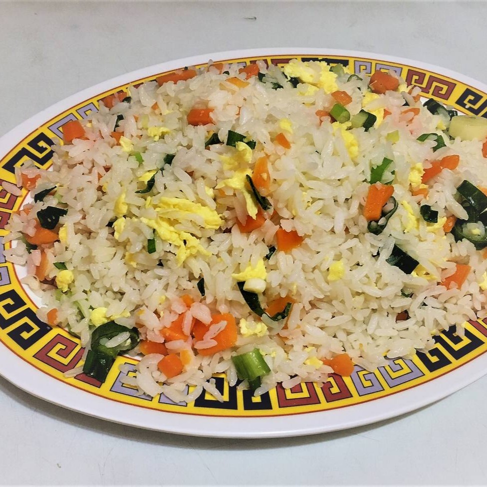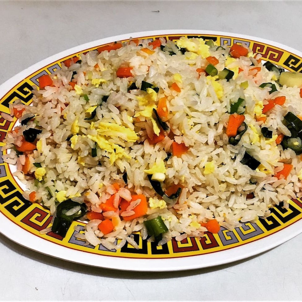 A deliciosa combinação de arroz, ovo, cebolinha e cenoura feita à moda Chinesa, sem presunto.