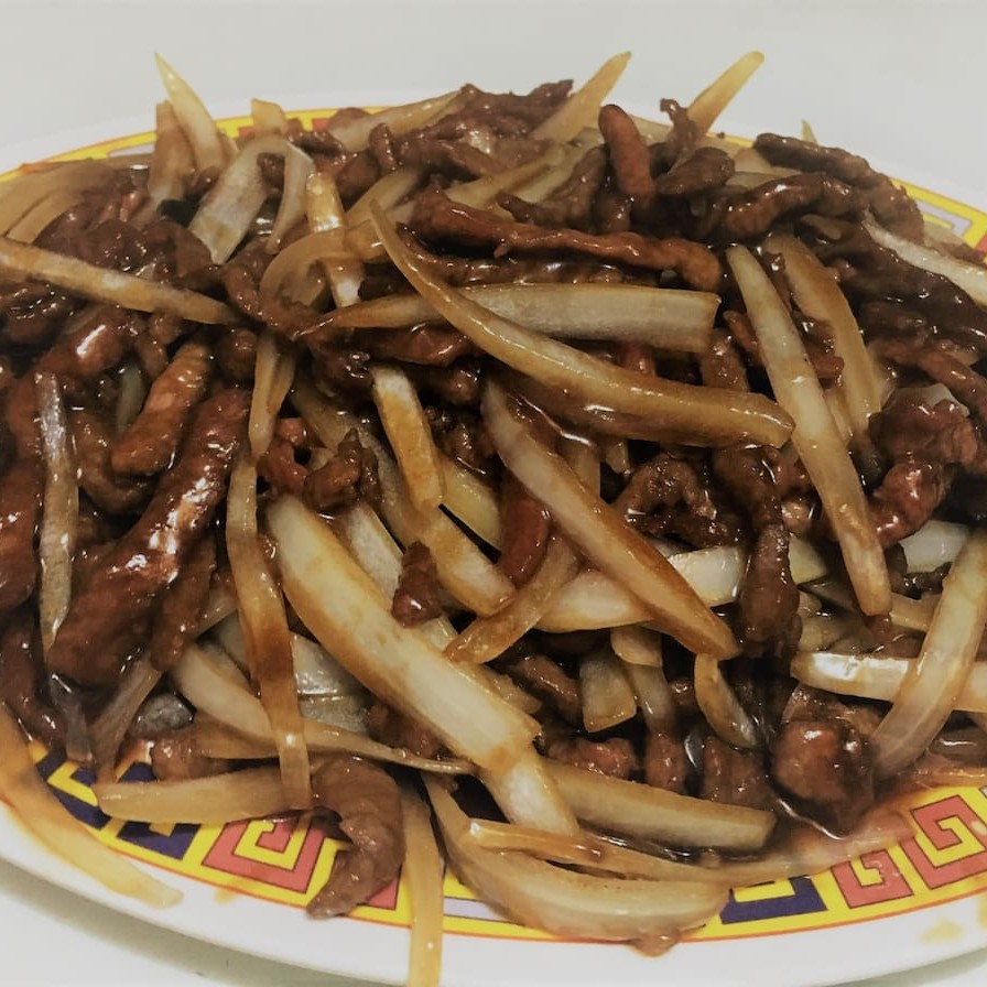 É um prato simples e delicioso. Carne e cebola cortadas em tira com o molho feito na hora do preparo.