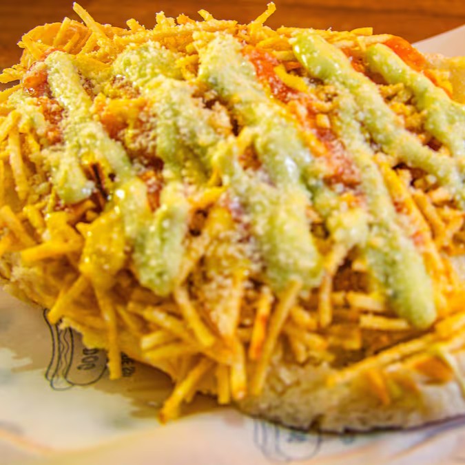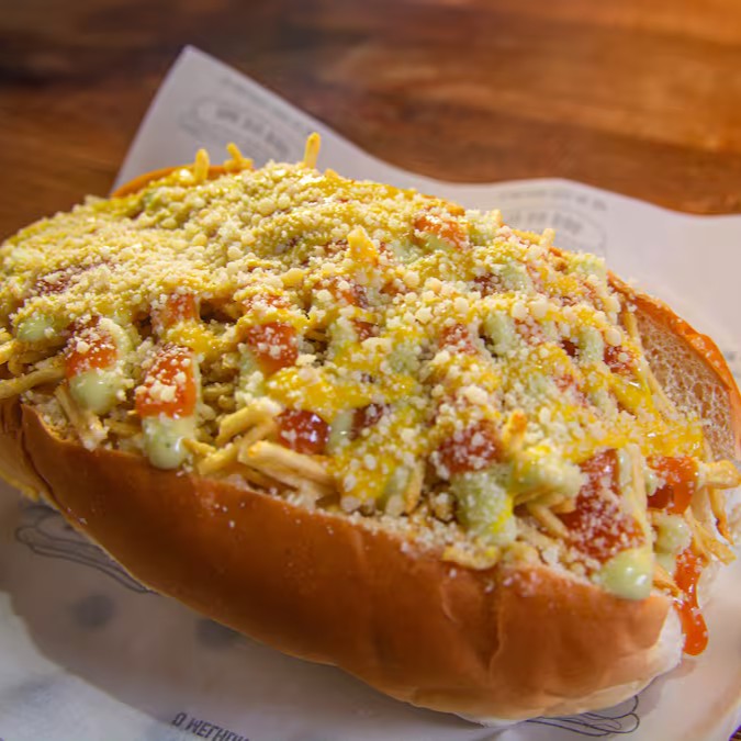 1 salsicha, catchup, mostarda, maionese temperada, vinagrete, milho, queijo ralado, batata palha e purê. Colab Tio do Dog x Tio Bar e Restaurante Os Queridinhos do Grupo Tio do Dog Limão Aqui!!! Serve 1 pessoa