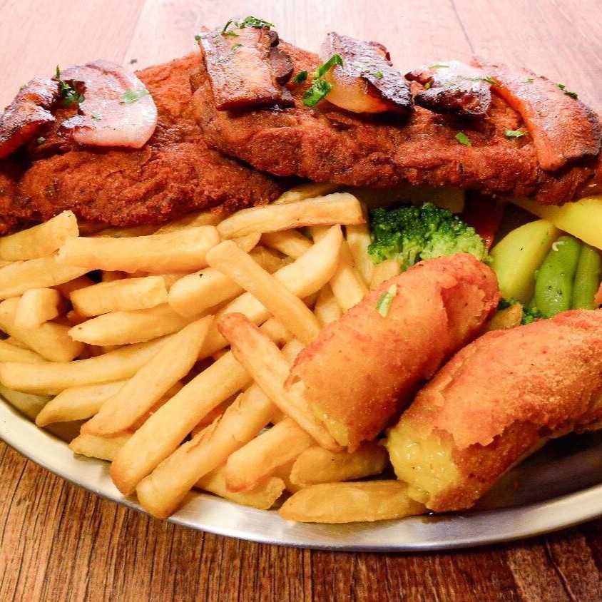 (2) Filé de peito de frango + Arroz branco + Feijão em caldo + Batata frita *Favor informar na observação se irá necessitar de talheres descartáveis! **Para este item não é possível a troca de componentes #tags: promoção - super - oferta - extra - refeição - prato - marmita - almoço - janta Serve 2 pessoas
