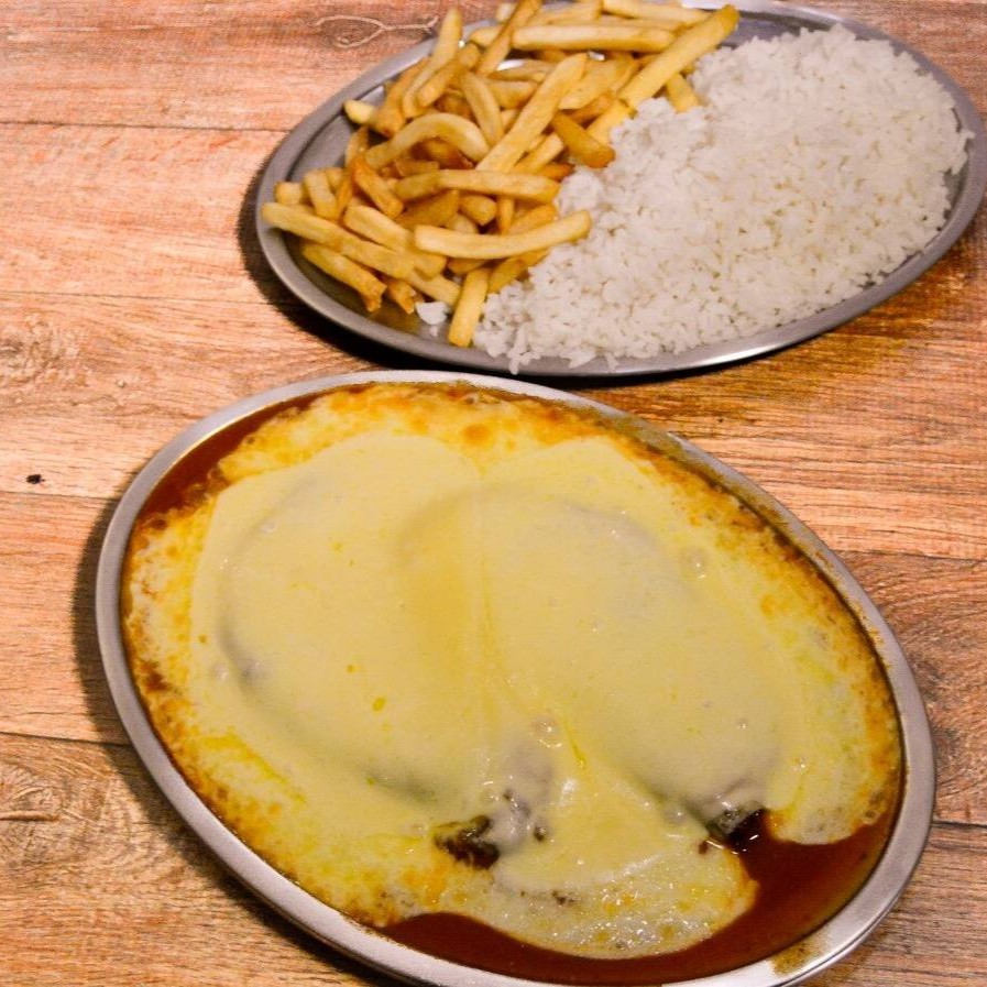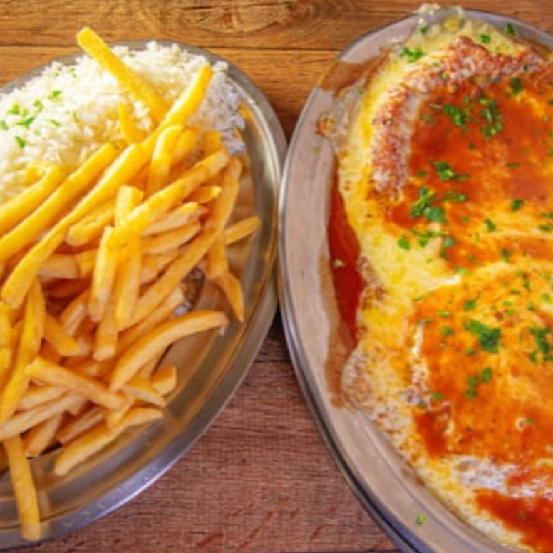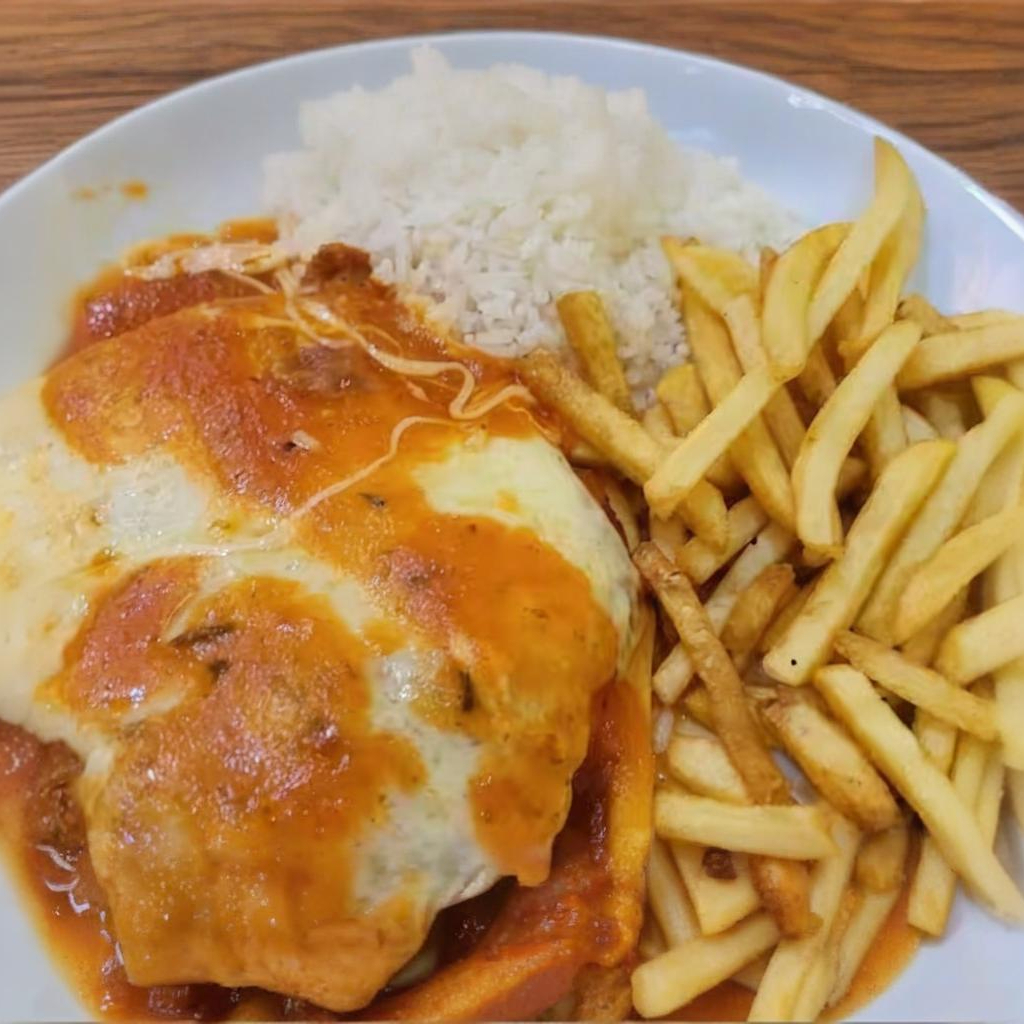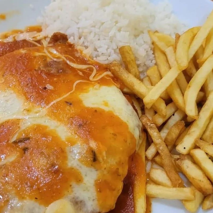 Filé de Frango com Queijo mussarela derretido e Saborosíssimo de Molho de tomate de sabor equilibrado. Acompanha Arroz Branco soltinho e Batatas Fritas crocantes . #tags: tipica - italiana - cozinha - culinária - almoço Serve 1 pessoa