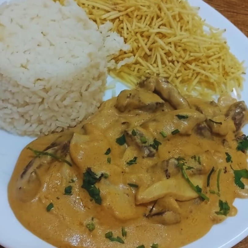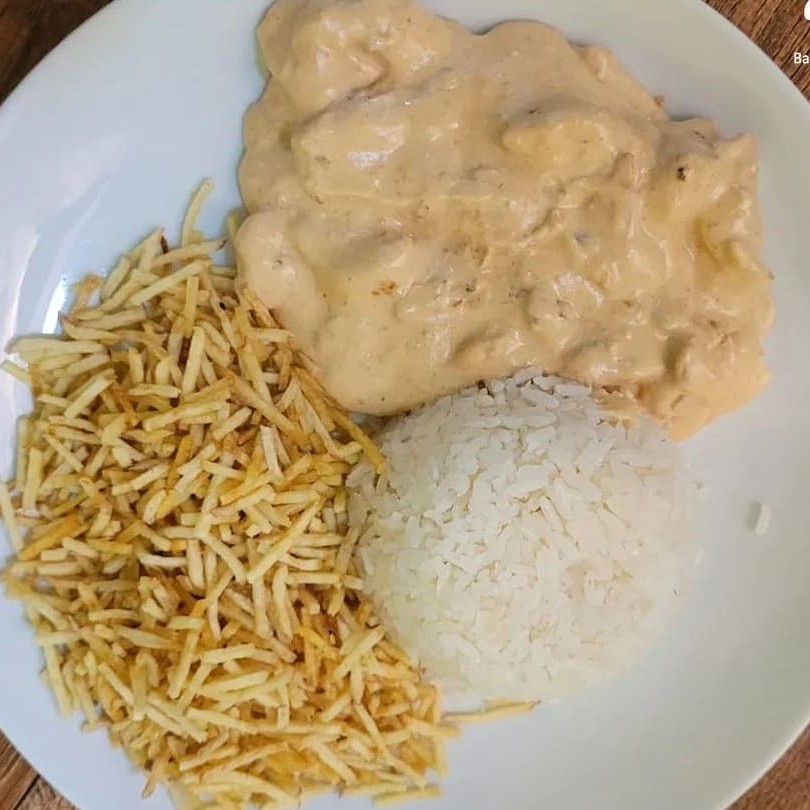 Estrogonofe pra Quem como pouco Pedaços de filé de Peito de Frango com um molho cremoso à base de creme de leite, que dá ao prato uma textura aveludada e um sabor rico. Acompanha Arroz branco e Batata Palha. #tags: culinária - francesa - comida - caseira - refeição *Imagem Ilustrativa Serve 1 pessoa