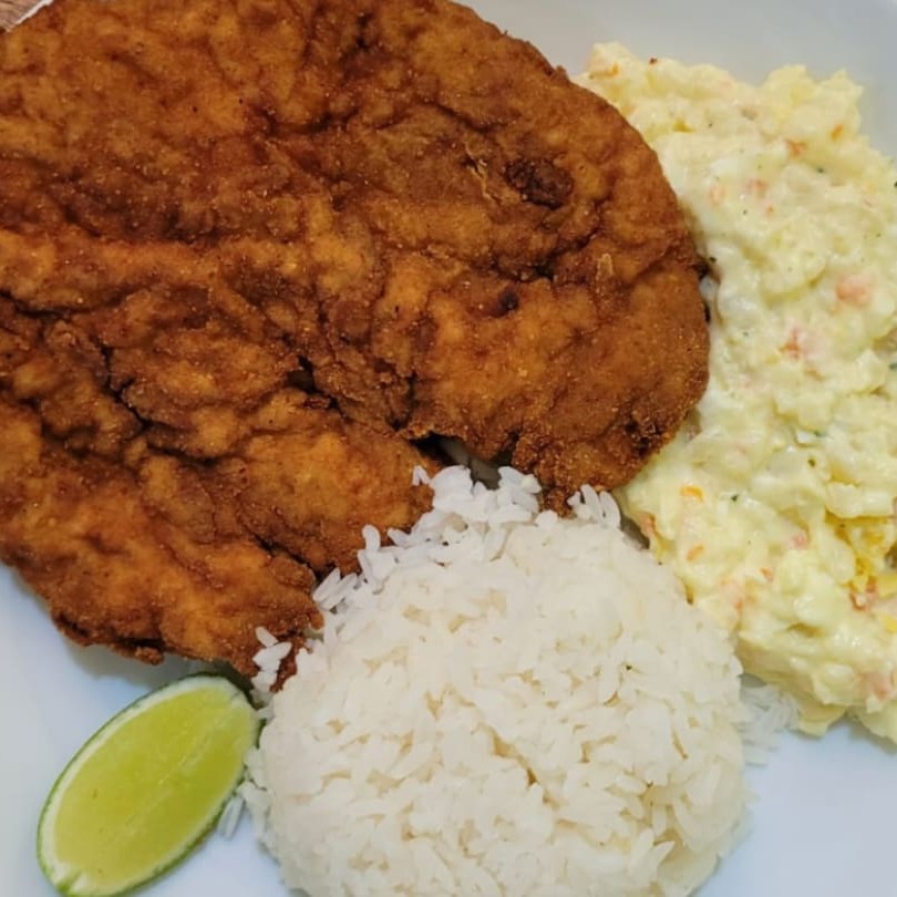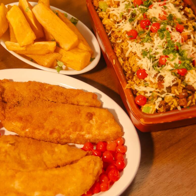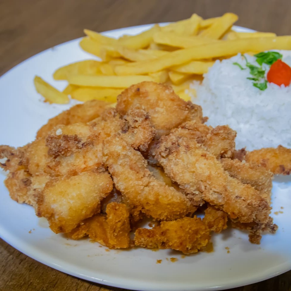 Iscas de Filé de Frango empanadinhas e bem sequinhas + Arroz branco + Feijão em caldo + Batata frita *Favor informar na observação se irá necessitar de talheres descartáveis! **Para este item não é possível a troca de componentes #tags: bbb - brasileiro - bom - barato